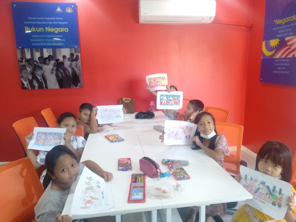 Mewarna lukisan berkaitan dengan tema Hari Gawai untuk meningkatkan semangat perayaan. Diakhiri dengan penyampaian hadiah kepada pemenang.