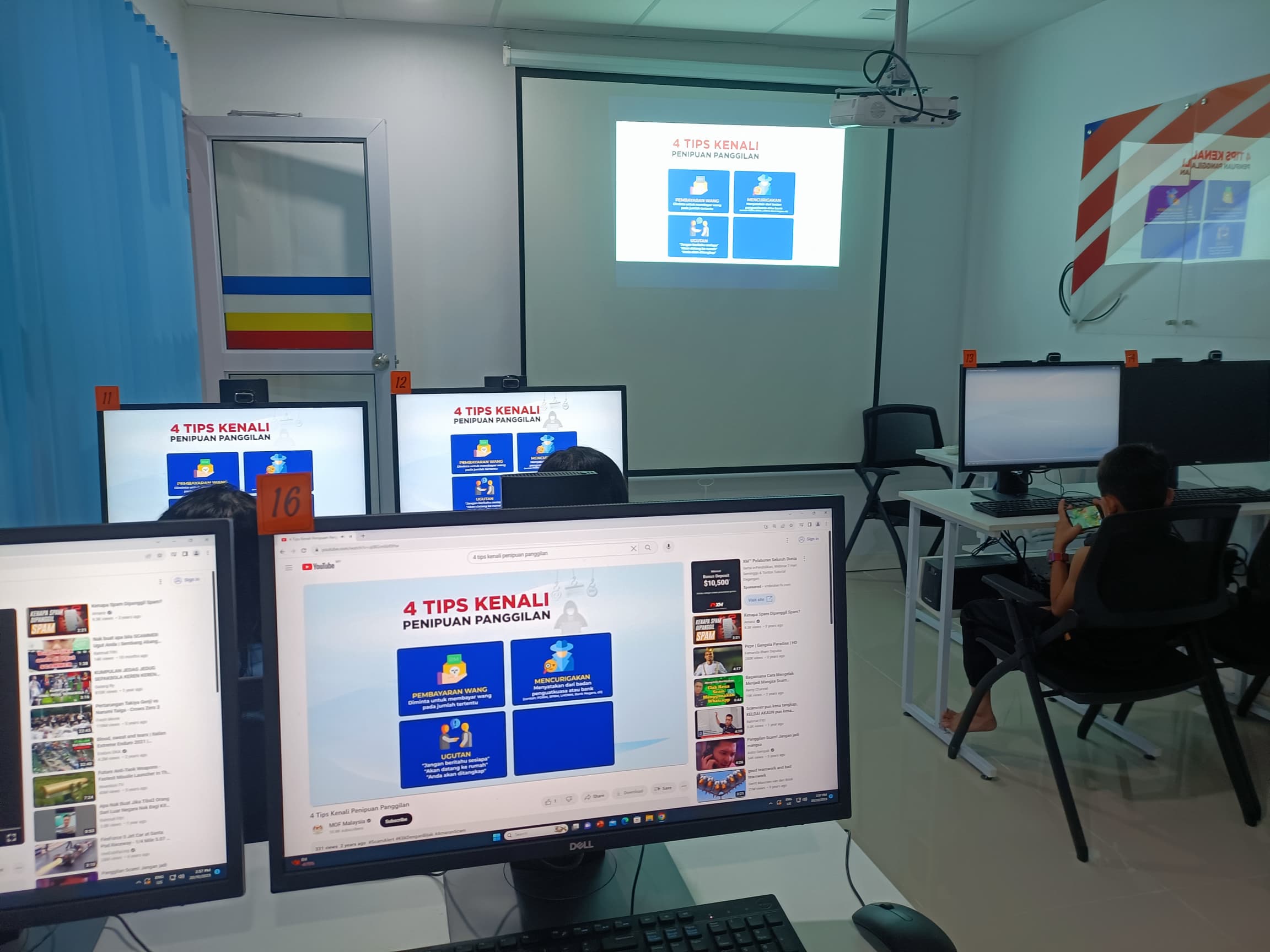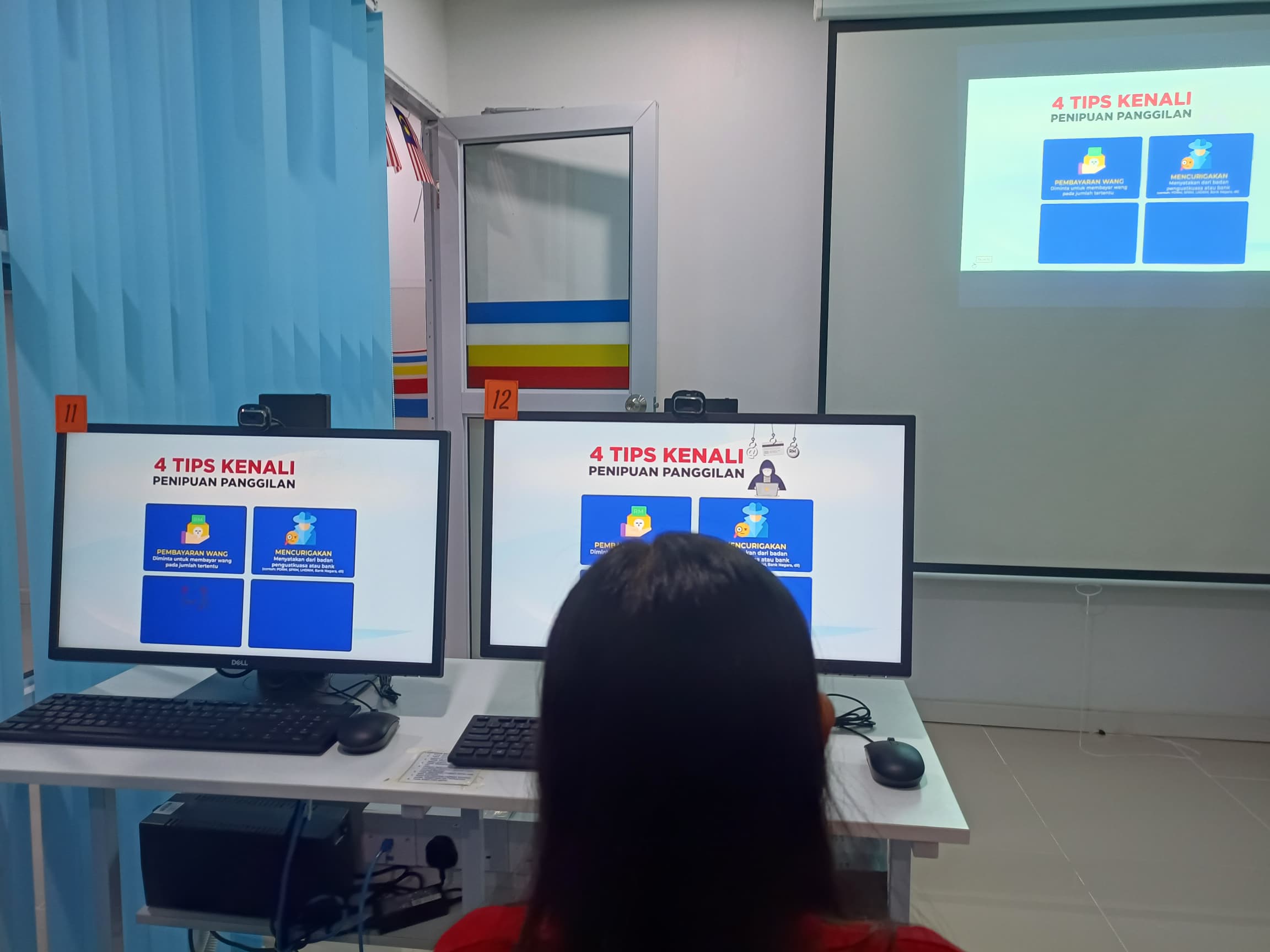 Penerangan melalui tayangan slide dan kanak-kanak diminta untuk menonton video Klik Dengan Bijak (Tips Kenali Penipuan Panggilan).