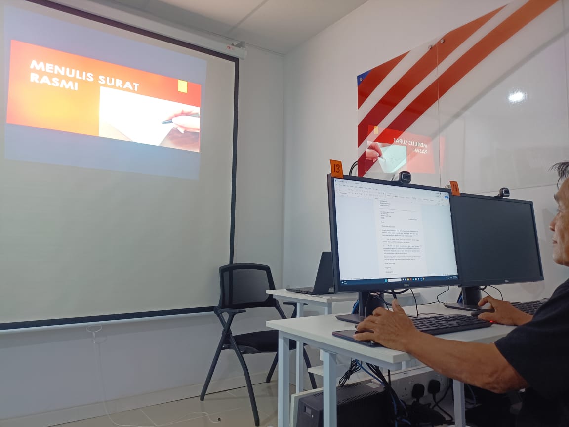 Mengajar usahawan untuk menggunakan Microsoft word untuk menaip surat rasmi. Selepas itu, usahawan diminta untuk mengikut contoh dan format yang betul di paparan slide yang disediakan.